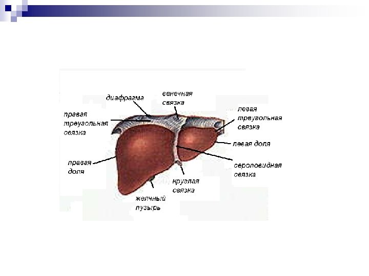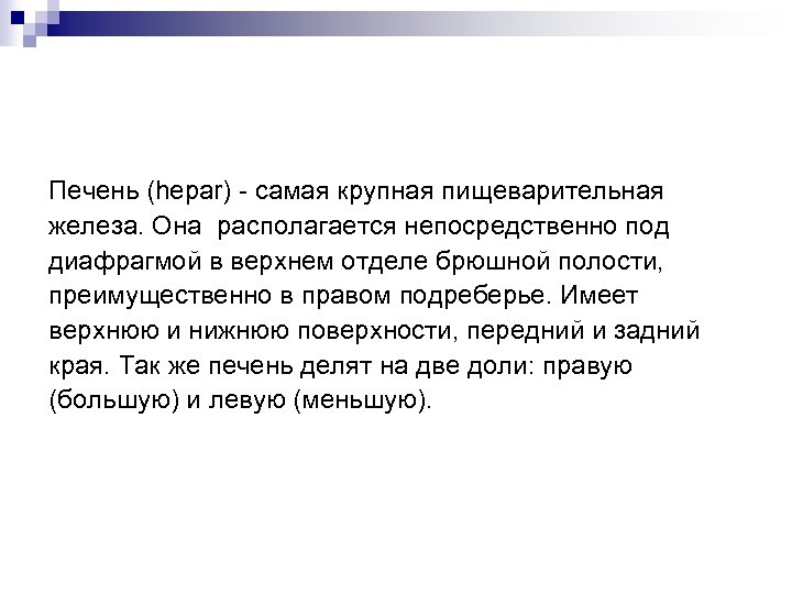 Печень (hepar) - самая крупная пищеварительная железа. Она располагается непосредственно под диафрагмой в верхнем отделе брюшной полости, преимущественно в правом подреберье. Имеет верхнюю и нижнюю поверхности, передний и задний края. Так же печень делят на две доли: правую (большую) и левую (меньшую).