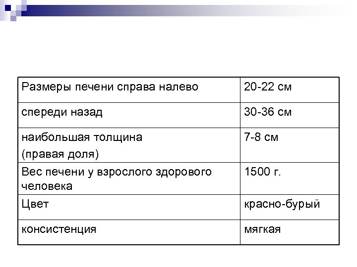 Размеры печени справа налево 20 -22 см спереди назад 30 -36 см наибольшая толщина (правая доля) 7 -8 см Вес печени у взрослого здорового человека Цвет 1500 г. консистенция мягкая красно-бурый