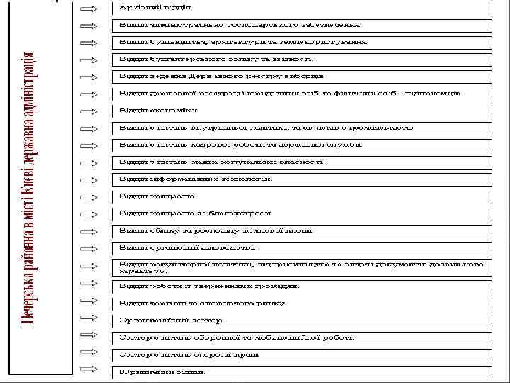 Структура апарату райдержадміністрації: організаційний відділ ; загальний відділ; юридичний сектор; сектор внутрішньої політики та зв'язків з громадськими організаціями і засобами масової інформації; ► сектор контролю; ► сектор кадрової роботи; ► ► ► відділ оборонної, мобілізаційної роботи та взаємодії з правоохоронними органами; ► відділ фінансово-господарського забезпечення.
