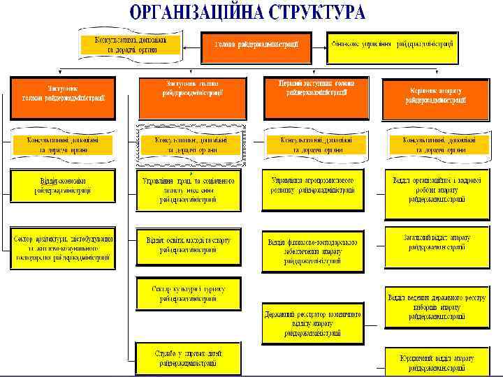 Структурні підрозділи райдержадміністрації: ► ► ► ► управління праці та соціального захисту населення; управління агропромислового розвитку; відділ освіти; відділ культури і туризму; управління економіки; відділ містобудування та архітектури; архівний відділ; відділ з питань фізичної культури і спорту; відділ у справах сім'ї та молоді ; відділ з питань надзвичайних ситуацій; служба у справах дітей; відділ з питань державної реєстрації; відділ з питань дозвільної системи; відділ розвитку інфраструктури та житлово-комунального господарства; відділ охорони здоров'я; фінансове управління.