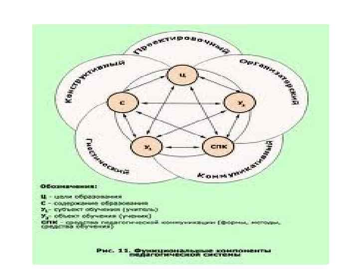 Конструктивный компонент - конструктивно-содержательный (отбор и композиция учебного материала, планирование и построение педагогического процесса); - конструктивно-оперативный (планирование своих действий и действий учащихся); - конструктивно-материальный (проектирование учебно-материальной базы педагогического процесса).