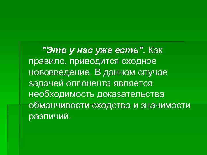 "Это у нас уже есть". Как правило, приводится сходное нововведение. В данном случае задачей оппонента является необходимость доказательства обманчивости сходства и значимости различий.