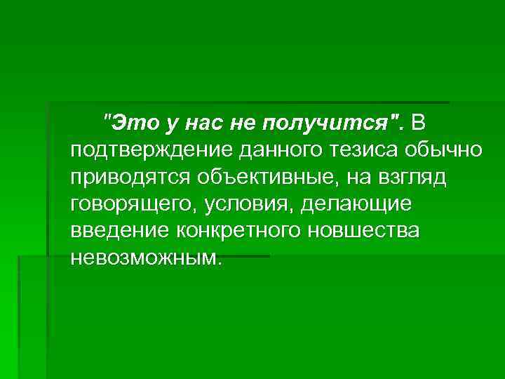"Это у нас не получится". В подтверждение данного тезиса обычно приводятся объективные, на взгляд говорящего, условия, делающие введение конкретного новшества невозможным.