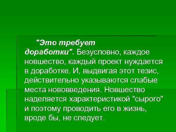 "Это требует доработки". Безусловно, каждое новшество, каждый проект нуждается в доработке. И, выдвигая этот тезис, действительно указываются слабые места нововведения. Новшество наделяется характеристикой "сырого" и поэтому проводить его в жизнь, вроде бы, не следует.
