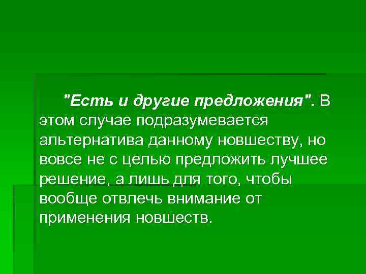 "Есть и другие предложения". В этом случае подразумевается альтернатива данному новшеству, но вовсе не с целью предложить лучшее решение, а лишь для того, чтобы вообще отвлечь внимание от применения новшеств.