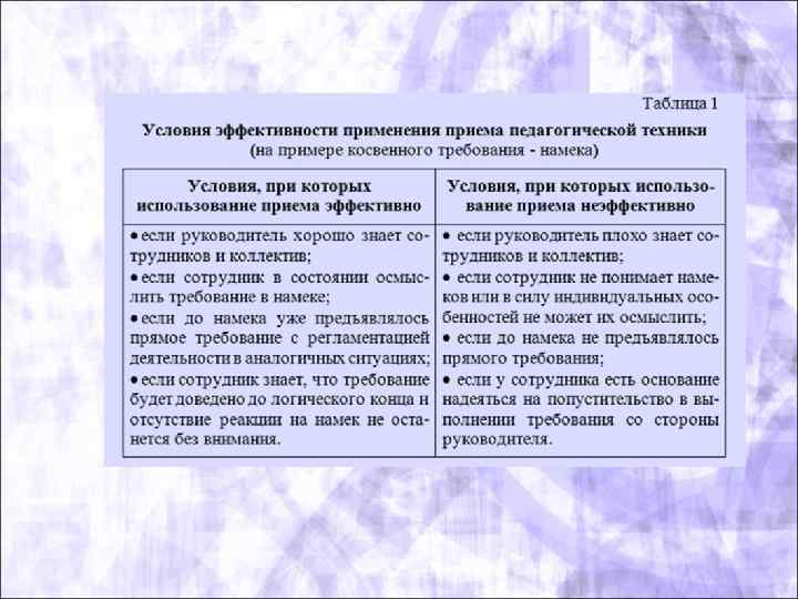 • Общепедагогические приемы, используемые руководителем в педагогической деятельности. В них в качестве компонентов могут входить приемы, как самоуправления, так и операционно деятельностные. Специальное изучение педагогических аспектов профессиональной деятельности руководителей структурных подразделений учреждений, организаций и фирм свидетельствует о том, что большинство приемов, состоящих из ряда операций, имеет выработанные психологией и педагогикой правила их успешной реализации. Например, применительно к использованию жестов существуют следующие правила: – жесты должны быть непроизвольными; – жестикуляция не должна быть непрерывной; – жест не должен отставать от подкрепляемого им слова; – жестикуляция должна быть разнообразной; – жесты должны соответствовать характеру речи, профессиональным и должностным особенностям аудитории.