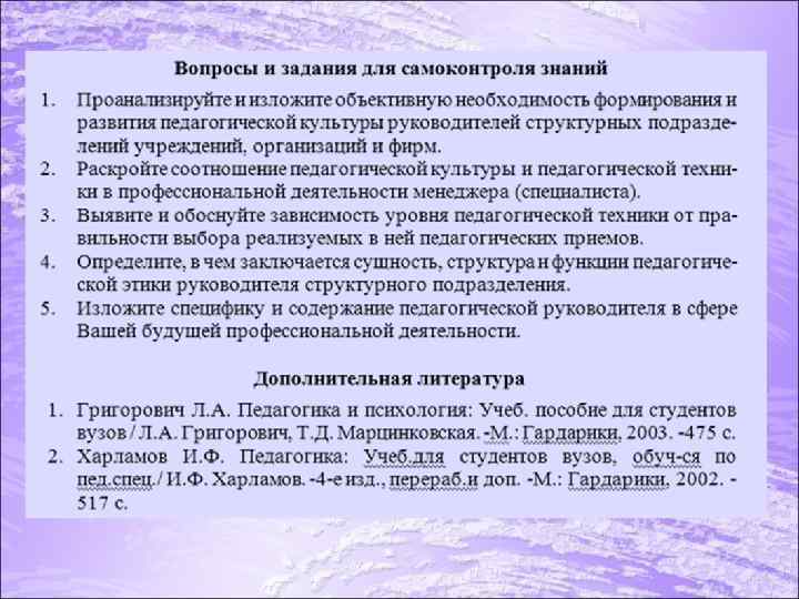 9. Воспитание сотрудников любой категории процесс постоянный, формирование личностных свойств и качеств постепенно переходит в их дальнейшее развитие и совершенствование, коррекцию отдельных действий и т. п. Тем не менее, формирование конкретной формы их поведения целесообразно заканчивать не по времени, а по результату. Любую работу по достижению чего либо целесообразно заканчивать, как только достигнут успех это дает человеку сильное эмоциональное удовлетворение. Как правило, в дальнейшем он будет поступать в подобных ситуациях так же. Это войдет в привычку, которая является одной из основ стиля деятельности. Обобщая содержание раздела можно сделать вывод, что педагогическая культура руководителя структурного подразделения учреждения, организации, фирмы является важным элементом его профессиональной деятельности. Она требует постоянного совершенствования в целях соответствия всем задачам профессионального обучения и воспитания. При этом важно, чтобы руководитель уделял достаточное внимание состоянию педагогической техники и принимал необходимые меры по ее развитию и совершенствованию в процессе своей профессиональной деятельности. Этому во многом способствует знание и соблюдение требований педагогической этики.
