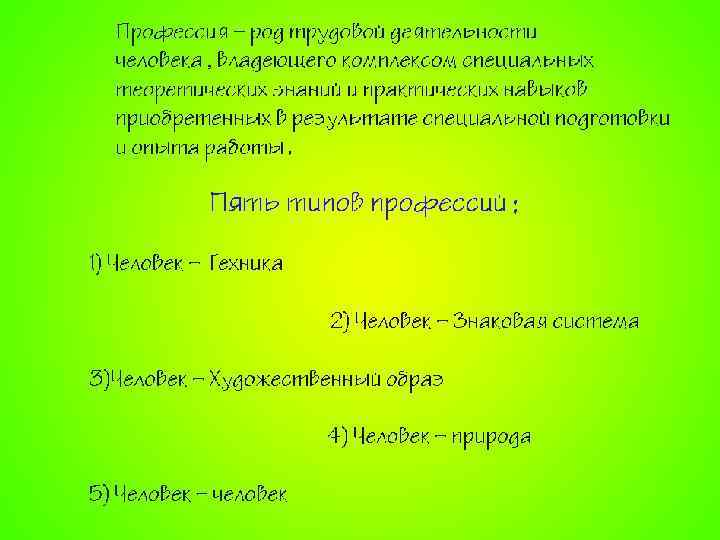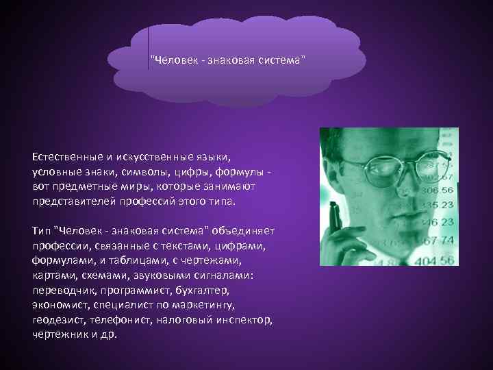"Человек - знаковая система" Естественные и искусственные языки, условные знаки, символы, цифры, формулы вот предметные миры, которые занимают представителей профессий этого типа. Тип "Человек - знаковая система" объединяет профессии, связанные с текстами, цифрами, формулами, и таблицами, с чертежами, картами, схемами, звуковыми сигналами: переводчик, программист, бухгалтер, экономист, специалист по маркетингу, геодезист, телефонист, налоговый инспектор, чертежник и др.