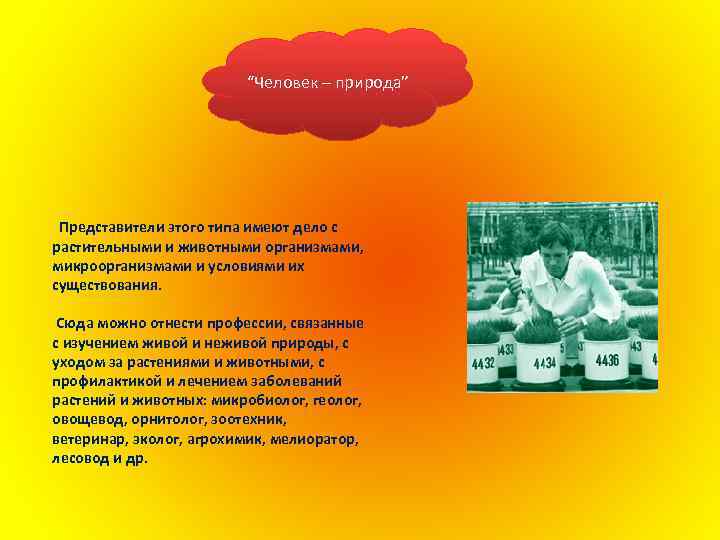 “Человек – природа” Представители этого типа имеют дело с растительными и животными организмами, микроорганизмами и условиями их существования. Сюда можно отнести профессии, связанные с изучением живой и неживой природы, с уходом за растениями и животными, с профилактикой и лечением заболеваний растений и животных: микробиолог, геолог, овощевод, орнитолог, зоотехник, ветеринар, эколог, агрохимик, мелиоратор, лесовод и др.
