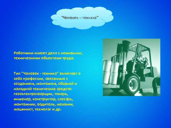 “Человек – техника” Работники имеют дело с неживыми, техническими объектами труда. Тип "Человек - техника" включает в себя профессии, связанные с созданием, монтажом, сборкой и наладкой технических средств: газоэлектросварщик, токарь, инженер, конструктор, слесарь, монтажник, водитель, механик, машинист, технолог и др.