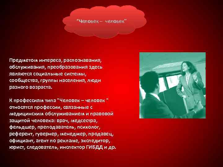 “Человек – человек” Предметом интереса, распознавания, обслуживания, преобразования здесь являются социальные системы, сообщества, группы населения, люди разного возраста. К профессиям типа "Человек – человек " относятся профессии, связанные с медицинским обслуживанием и правовой защитой человека: врач, медсестра, фельдшер, преподаватель, психолог, референт, гувернер, менеджер, продавец, официант, агент по рекламе, экспедитор, юрист, следователь, инспектор ГИБДД и др.