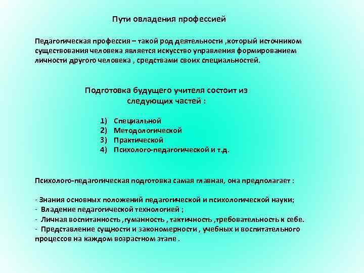 Пути овладения профессией Педагогическая профессия – такой род деятельности , который источником существования человека является искусство управления формированием личности другого человека , средствами своих специальностей. Подготовка будущего учителя состоит из следующих частей : 1) 2) 3) 4) Специальной Методологической Практической Психолого-педагогической и т. д. Психолого-педагогическая подготовка самая главная, она предполагает : - Знания основных положений педагогической и психологической науки; - Владение педагогической технологией ; - Личная воспитанность , гуманность , тактичность , требовательность к себе. - Представление сущности и закономерности , учебных и воспитательного процессов на каждом возрастном этапе.