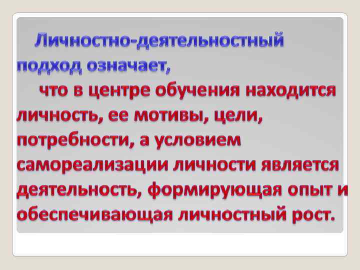 СВОБОДА ВЫБОРА ПУТИ, УЧЕБНИКА, МЕТОДОВ, ПЕДАГОГА, что ведёт к обеспечению безопасности личностных проявлений, организации условий самоактуализации и личностного роста АКТИВНОСТЬ САМОГО УЧЕНИКА ЕДИНСТВО ВНЕШНИХ (достижение) И ВНУТРЕННИХ (познавательные) МОТИВОВ ПРИНЯТИЕ УЧЕБНОЙ ЗАДАЧИ И УДОВЛЕТВОРЕНИЕ ОТ ЕЁ РЕШЕНИЯ В СОТРУДНИЧЕСТВЕ С ДРУГИМИ, что ведёт к чувствам компетентности, аффилиации, уверенности в себе и собственного достоинства УЧЕНИК КАК СУБЪЕКТ ОБРАЗОВАТЕЛЬНОГО ПРОЦЕССА