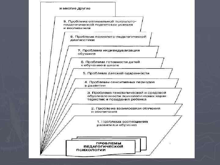 Основные проблемы педагогической психологии Проблема педагогической запущенности ребенка Под которой подразумевается его не способность к усвоению педагогических воздействий и ускоренному развитию, вызванную устранимыми причинами, в частности тем, что на более ранних этапах своего развития ребенка плохо обучали и воспитывали
