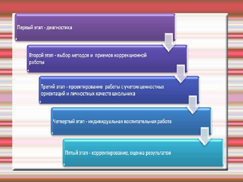 Пятый этап работы Коррекция – это способ педагогического воздействия на личность, способствующий исправлению ее развития, закреплению позитивных или преодолению негативных качеств. Корректирование дает возможность уточнить или пересмотреть коллективные или групповые воспитательные программы, характеристики школьников, а также используется при выборе методов и форм деятельности. Оно завершает индивидуализацию воспитательного процесса и опирается на его результаты. Наиболее эффективными методами и приемами корректирования являются наблюдение и самонаблюдение, анализ и оценка, самооценка и переоценка, контроль и самоконтроль. Все эти методы и приемы используются в комплексе с учетом результатов индивидуальной работы с учащимися.