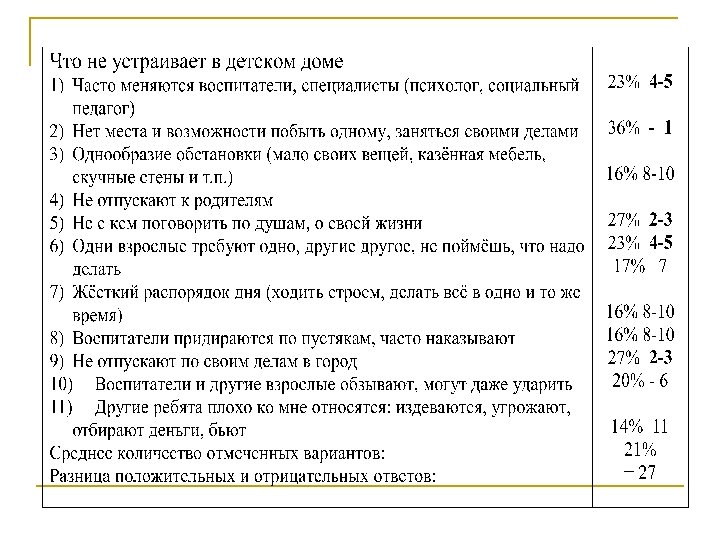 продолжение n n Недостаточный уровень психолого-педагогической компетентности работников учреждений общественного воспитания. Недостатки программы воспитания и обучения, не компенсирующие дефектов развития, вызванных отсутствием семьи. Бедность конкретно-чувственного опыта детей, обусловленная скудостью окружающей среды, малого числа и однообразия предметов, с которыми дети оперируют. Постоянное нахождение детей в условиях коллектива, отсутствие психологических ниш, предполагающих возможность уединения и дружеского общения.