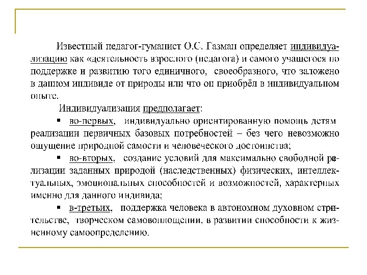 Индивидуализация n n Внеучебная деятельность осуществляется педагогом через привлечение детей к различным видам творческой и спортивной самореализации. Педагог помогает воспитанникам группы понять свои особенности, сильные и слабые стороны личности, выявить и проявить свои таланты и способности в наиболее привлекательных для них видах творческой и спортивной деятельности. Результатом этого является личностная и творческая самореализация каждого ребёнка.
