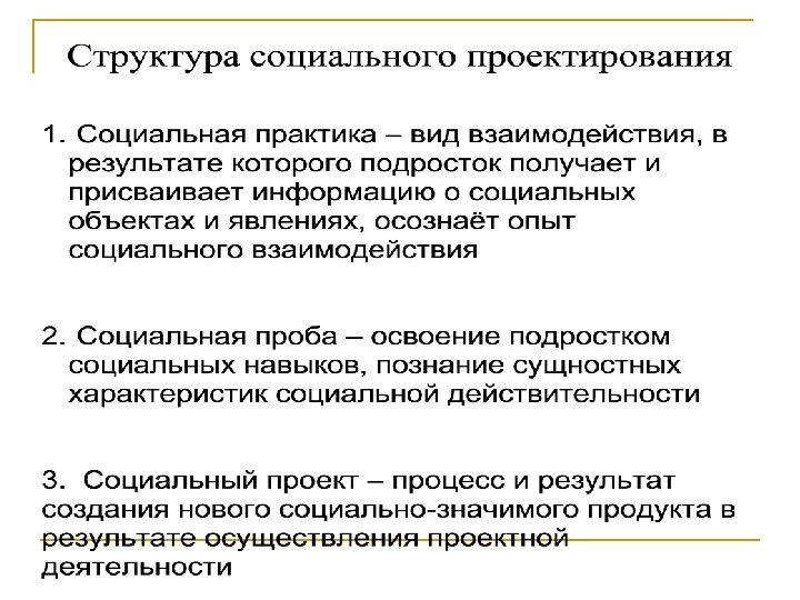 Объекты проектирования Социальные явления, болезни (наркомания, алкоголизм курение, сквернословие) Социальные отношения (отношение к старикам, детям, молодёжи, клиенту…) Социальные институты (партии, органы управления, школа. . . ) Социальная среда (городской и сельский ландшафт, социальная инфраструктура, внешний вид (стадиона, площадок). . . Субъекты проектирования n Подростки и взрослые вовлечённые в процесс совместного проектирования