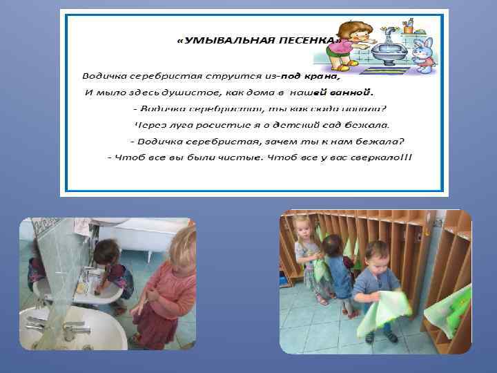 «Руки с мылом надо мыть, Рукава нельзя мочить. Кто рукавчик не засучит, Тот водички не получит» .