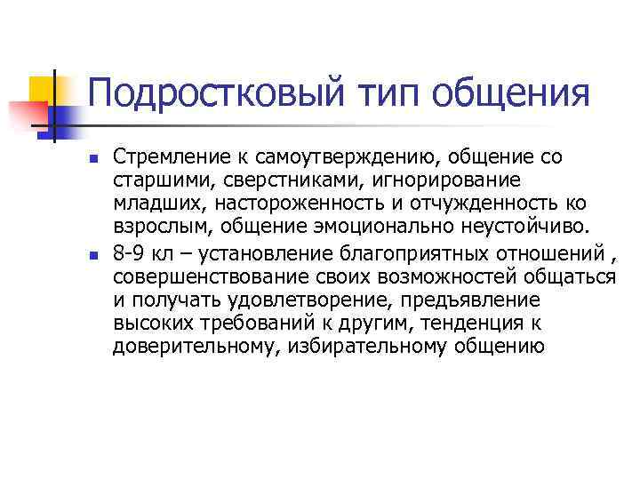 Подростковый тип общения n n Стремление к самоутверждению, общение со старшими, сверстниками, игнорирование младших, настороженность и отчужденность ко взрослым, общение эмоционально неустойчиво. 8 -9 кл – установление благоприятных отношений , совершенствование своих возможностей общаться и получать удовлетворение, предъявление высоких требований к другим, тенденция к доверительному, избирательному общению