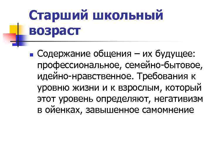 Старший школьный возраст n Содержание общения – их будущее: профессиональное, семейно-бытовое, идейно-нравственное. Требования к уровню жизни и к взрослым, который этот уровень определяют, негативизм в ойенках, завышенное самомнение