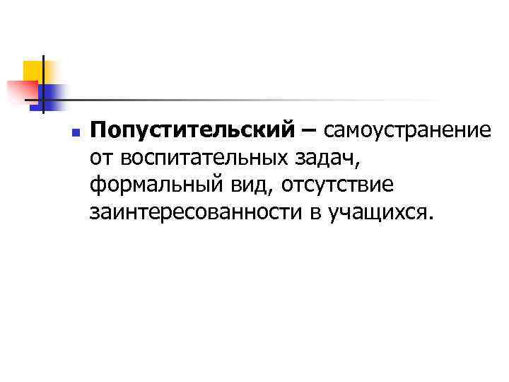 n Попустительский – самоустранение от воспитательных задач, формальный вид, отсутствие заинтересованности в учащихся.