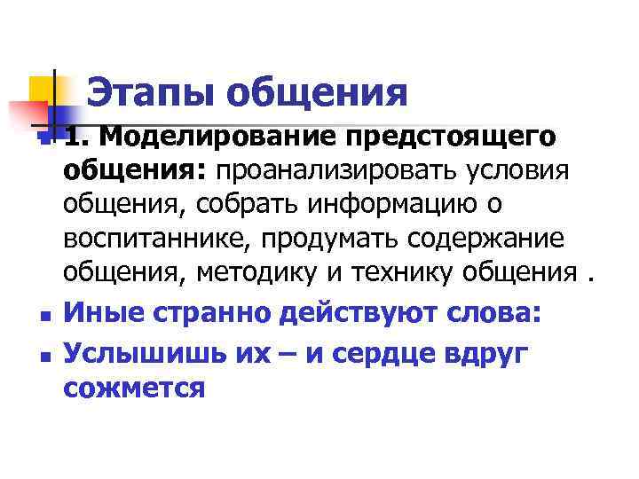Этапы общения n n n 1. Моделирование предстоящего общения: проанализировать условия общения, собрать информацию о воспитаннике, продумать содержание общения, методику и технику общения. Иные странно действуют слова: Услышишь их – и сердце вдруг сожмется