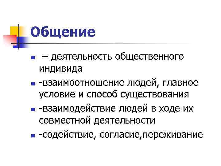 Общение n n – деятельность общественного индивида -взаимоотношение людей, главное условие и способ существования -взаимодействие людей в ходе их совместной деятельности -содействие, согласие, переживание