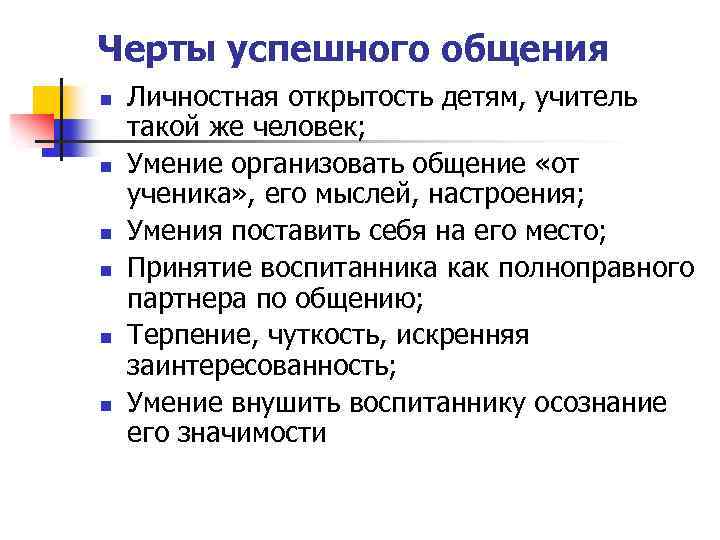 Черты успешного общения n n n Личностная открытость детям, учитель такой же человек; Умение организовать общение «от ученика» , его мыслей, настроения; Умения поставить себя на его место; Принятие воспитанника как полноправного партнера по общению; Терпение, чуткость, искренняя заинтересованность; Умение внушить воспитаннику осознание его значимости