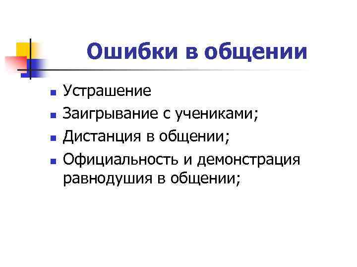 Ошибки в общении n n Устрашение Заигрывание с учениками; Дистанция в общении; Официальность и демонстрация равнодушия в общении;