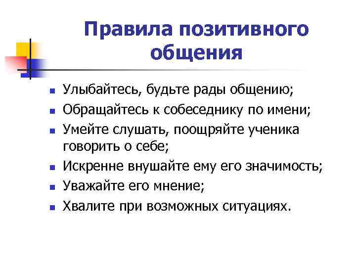 Правила позитивного общения n n n Улыбайтесь, будьте рады общению; Обращайтесь к собеседнику по имени; Умейте слушать, поощряйте ученика говорить о себе; Искренне внушайте ему его значимость; Уважайте его мнение; Хвалите при возможных ситуациях.