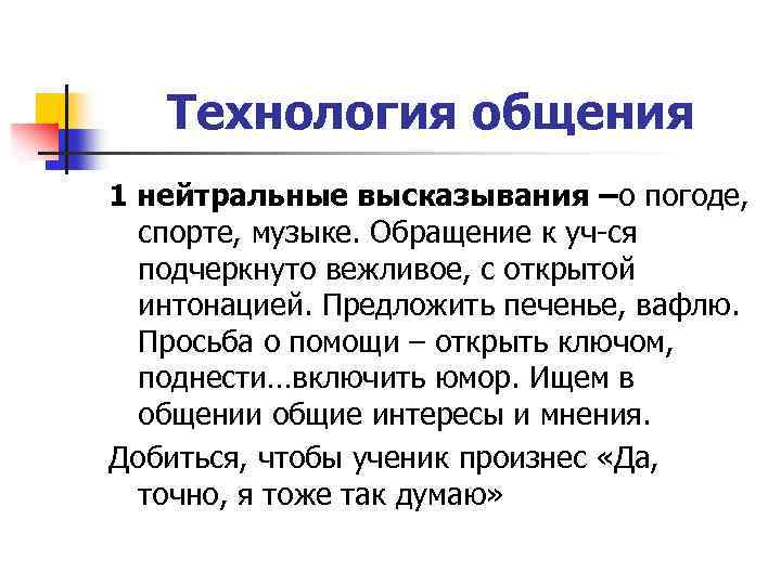 Технология общения 1 нейтральные высказывания –о погоде, спорте, музыке. Обращение к уч-ся подчеркнуто вежливое, с открытой интонацией. Предложить печенье, вафлю. Просьба о помощи – открыть ключом, поднести…включить юмор. Ищем в общении общие интересы и мнения. Добиться, чтобы ученик произнес «Да, точно, я тоже так думаю»