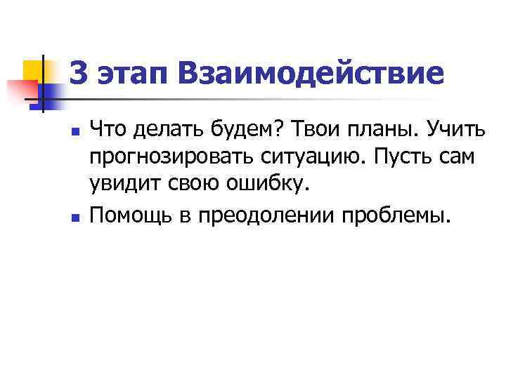 3 этап Взаимодействие n n Что делать будем? Твои планы. Учить прогнозировать ситуацию. Пусть сам увидит свою ошибку. Помощь в преодолении проблемы.