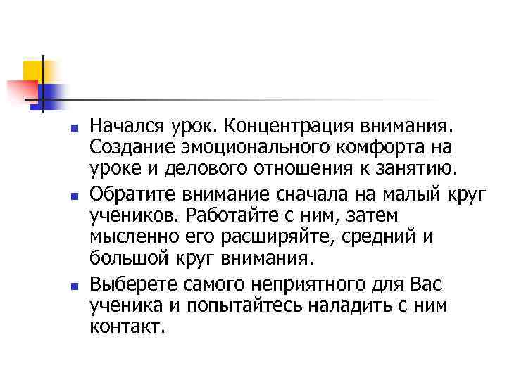 n n n Начался урок. Концентрация внимания. Создание эмоционального комфорта на уроке и делового отношения к занятию. Обратите внимание сначала на малый круг учеников. Работайте с ним, затем мысленно его расширяйте, средний и большой круг внимания. Выберете самого неприятного для Вас ученика и попытайтесь наладить с ним контакт.