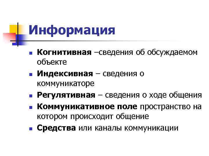 Информация n n n Когнитивная –сведения об обсуждаемом объекте Индексивная – сведения о коммуникаторе Регулятивная – сведения о ходе общения Коммуникативное поле пространство на котором происходит общение Средства или каналы коммуникации