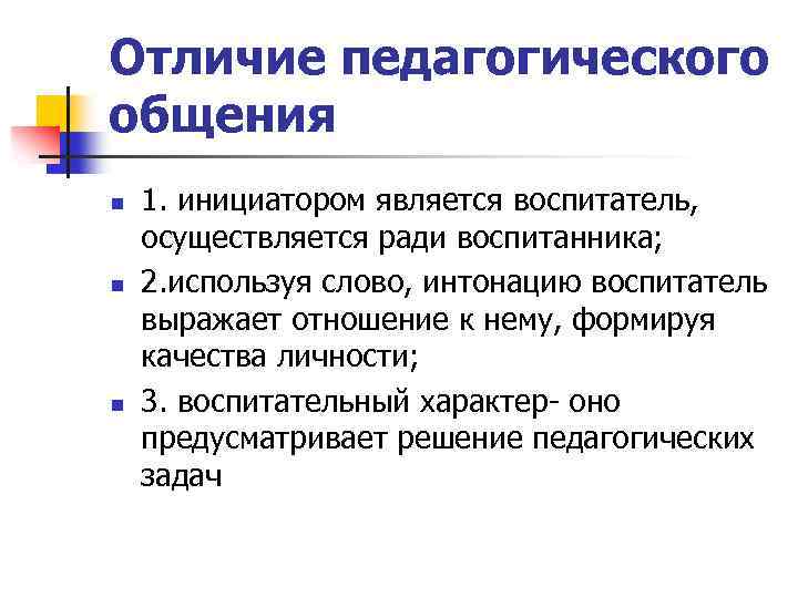 Отличие педагогического общения n n n 1. инициатором является воспитатель, осуществляется ради воспитанника; 2. используя слово, интонацию воспитатель выражает отношение к нему, формируя качества личности; 3. воспитательный характер- оно предусматривает решение педагогических задач