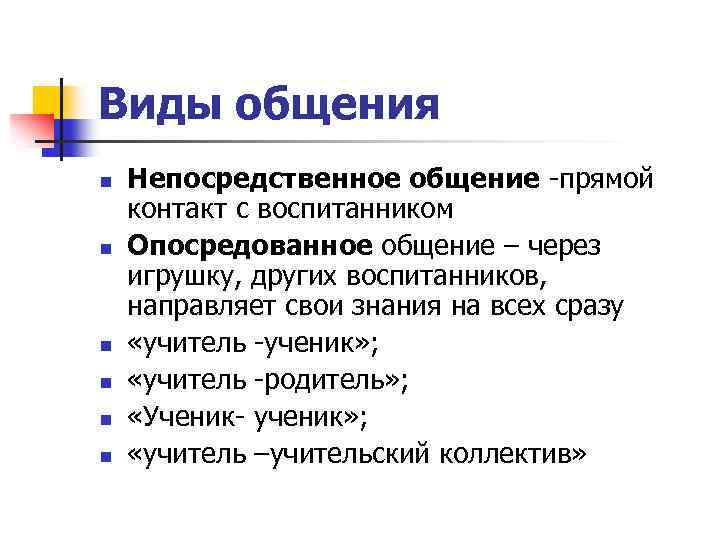 Виды общения n n n Непосредственное общение -прямой контакт с воспитанником Опосредованное общение – через игрушку, других воспитанников, направляет свои знания на всех сразу «учитель -ученик» ; «учитель -родитель» ; «Ученик- ученик» ; «учитель –учительский коллектив»