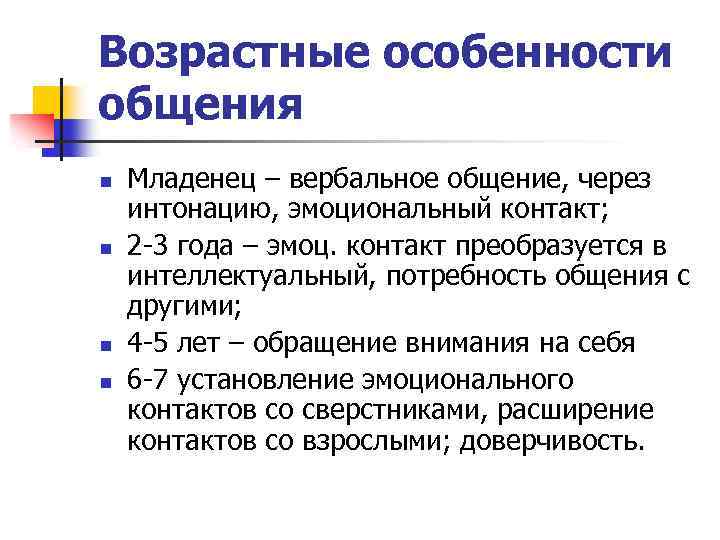 Возрастные особенности общения n n Младенец – вербальное общение, через интонацию, эмоциональный контакт; 2 -3 года – эмоц. контакт преобразуется в интеллектуальный, потребность общения с другими; 4 -5 лет – обращение внимания на себя 6 -7 установление эмоционального контактов со сверстниками, расширение контактов со взрослыми; доверчивость.