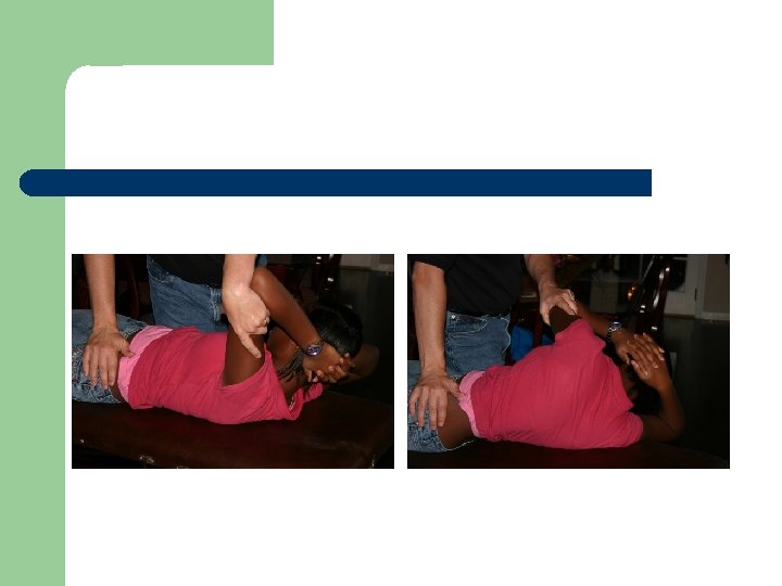 Lumbar rotation technique l Patient is supine. Have the patient lace fingers behind head. Standing to the side of the patient grab the patient’s contra lateral upper arm and pull toward you and caudally.