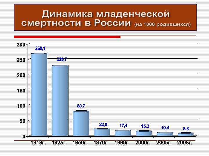 Динамика младенческой смертности в некоторых странах мира Страны 1913 1930 1950 1970 1990 2005 Россия 269, 3 230, 6 80, 7 22, 8 17, 4 14, 6 10, 4 Австрия 156, 9 103, 7 66, 1 25, 9 10, 2 5, 6 4, 1 Англия 79, 8 59, 7 29, 9 18, 2 9, 1 5, 8 5, 2 Франция 98, 9 78, 3 52, 1 15, 3 8, 3 4, 8 4, 4 Швеция 63, 2 55, 4 21, 3 11, 2 5, 9 3, 4 3, 7 США 86, 4 66, 2 29, 2 21, 4 10, 1 6, 9 5, 9