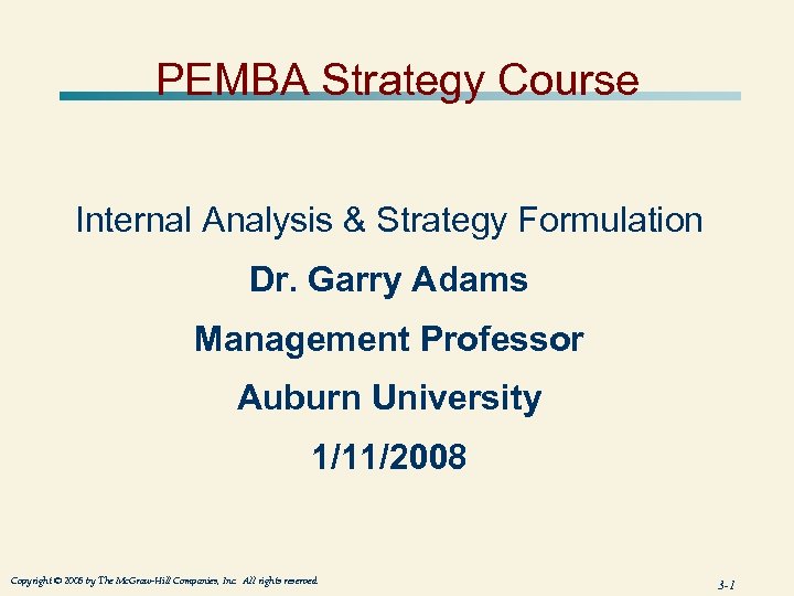 PEMBA Strategy Course Internal Analysis & Strategy Formulation Dr. Garry Adams Management Professor Auburn University 1/11/2008 Copyright © 2005 by The Mc. Graw-Hill Companies, Inc. All rights reserved. 3 -1