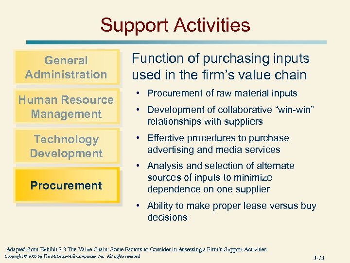 Support Activities General Administration Human Resource Management Technology Development Related to a wide range of activities and those embodied in processes and equipment and the product itself • Effective R&D activities for process and product initiatives • Positive collaborative relationships between R&D and other departments • State-of-the art facilities and equipment • Culture to enhance creativity and innovation • Excellent professional qualifications of personnel • Ability to meet critical deadlines Adapted from Exhibit 3. 3 The Value Chain: Some Factors to Consider in Assessing a Firm’s Support Activities Copyright © 2005 by The Mc. Graw-Hill Companies, Inc. All rights reserved. 3 -12