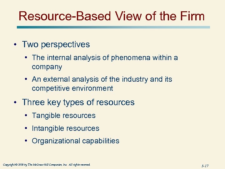 Resource-Based View of the Firm • Two perspectives • The internal analysis of phenomena within a company • An external analysis of the industry and its competitive environment • Three key types of resources • Tangible resources • Intangible resources • Organizational capabilities Copyright © 2005 by The Mc. Graw-Hill Companies, Inc. All rights reserved. 3 -17