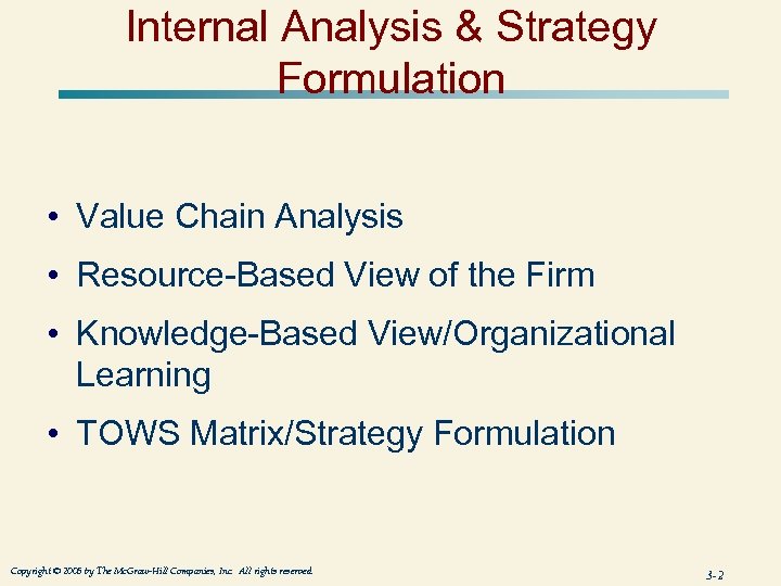 Internal Analysis & Strategy Formulation • Value Chain Analysis • Resource-Based View of the Firm • Knowledge-Based View/Organizational Learning • TOWS Matrix/Strategy Formulation Copyright © 2005 by The Mc. Graw-Hill Companies, Inc. All rights reserved. 3 -2