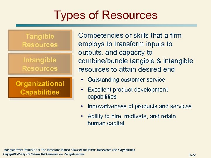 Types of Resources Tangible Resources Intangible Resources Difficult for competitors (and the firm itself) to account for or imitate, typically embedded in unique routines and practices that have evolved over time • Innovation and creativity n n Technical and scientific skills Innovation capacities • Reputation n n Effective strategic planning processes Excellent evaluation and control systems Adapted from Exhibit 3. 4 The Resource-Based View of the Firm: Resources and Capabilities Copyright © 2005 by The Mc. Graw-Hill Companies, Inc. All rights reserved. 3 -21