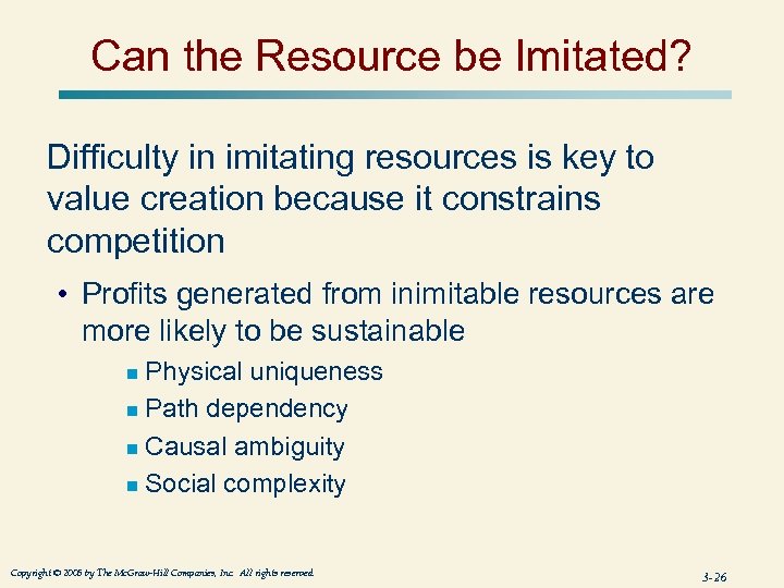 Is the Resource Rare? Organizational resources also possessed by competitors are not sources of competitive advantage • Common strategies based on similar resources give no one firm an advantage • Competitive advantages are gained only from uncommon resources, resources that are rare to other competitors Copyright © 2005 by The Mc. Graw-Hill Companies, Inc. All rights reserved. 3 -25