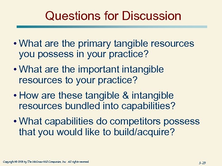 Questions for Discussion • What are the primary tangible resources you possess in your practice? • What are the important intangible resources to your practice? • How are these tangible & intangible resources bundled into capabilities? • What capabilities do competitors possess that you would like to build/acquire? Copyright © 2005 by The Mc. Graw-Hill Companies, Inc. All rights reserved. 3 -29
