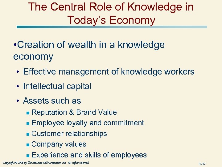 The Central Role of Knowledge in Today’s Economy • Creation of wealth in a knowledge economy • Effective management of knowledge workers • Intellectual capital • Assets such as Reputation & Brand Value n Employee loyalty and commitment n Customer relationships n Company values n Experience and skills of employees n Copyright © 2005 by The Mc. Graw-Hill Companies, Inc. All rights reserved. 3 -31