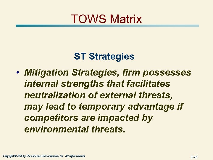 TOWS Matrix ST Strategies • Mitigation Strategies, firm possesses internal strengths that facilitates neutralization of external threats, may lead to temporary advantage if competitors are impacted by environmental threats. Copyright © 2005 by The Mc. Graw-Hill Companies, Inc. All rights reserved. 3 -40