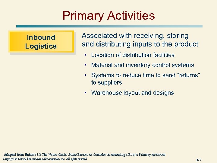 Primary Activities Inbound Logistics Associated with receiving, storing and distributing inputs to the product • Location of distribution facilities • Material and inventory control systems • Systems to reduce time to send “returns” to suppliers • Warehouse layout and designs Adapted from Exhibit 3. 2 The Value Chain: Some Factors to Consider in Assessing a Firm’s Primary Activities Copyright © 2005 by The Mc. Graw-Hill Companies, Inc. All rights reserved. 3 -5